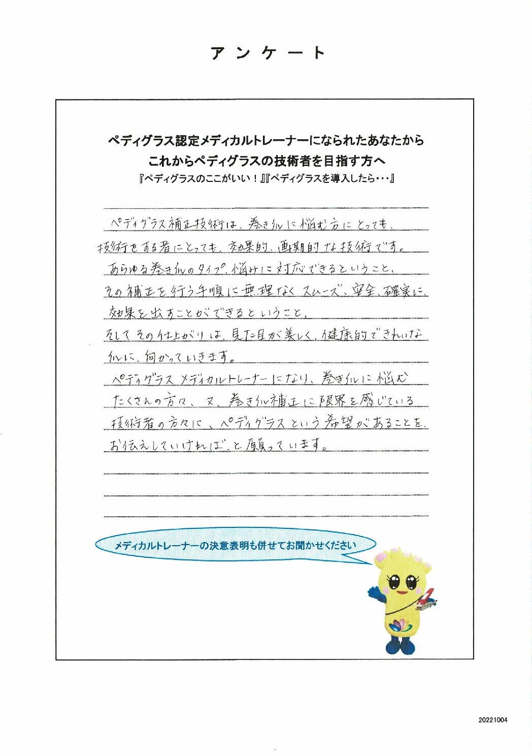 ペディグラスメディカルトレーナーになり、巻き爪に悩むたくさんの方々、又、巻き爪補正に限界を感じている技術者の方々にペディグラスという希望があることを、お伝えしていければ、と願っています。