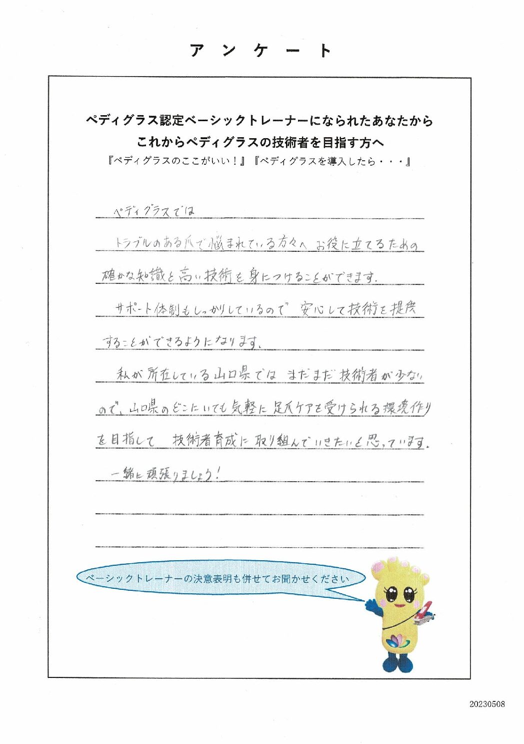 私が所在している山口県では、まだまだ技術者が少ないので、山口県のどこにいても気軽に足爪ケアを受けられる環境作りを目指して、技術者育成に取り組んでいきたいと思っています。